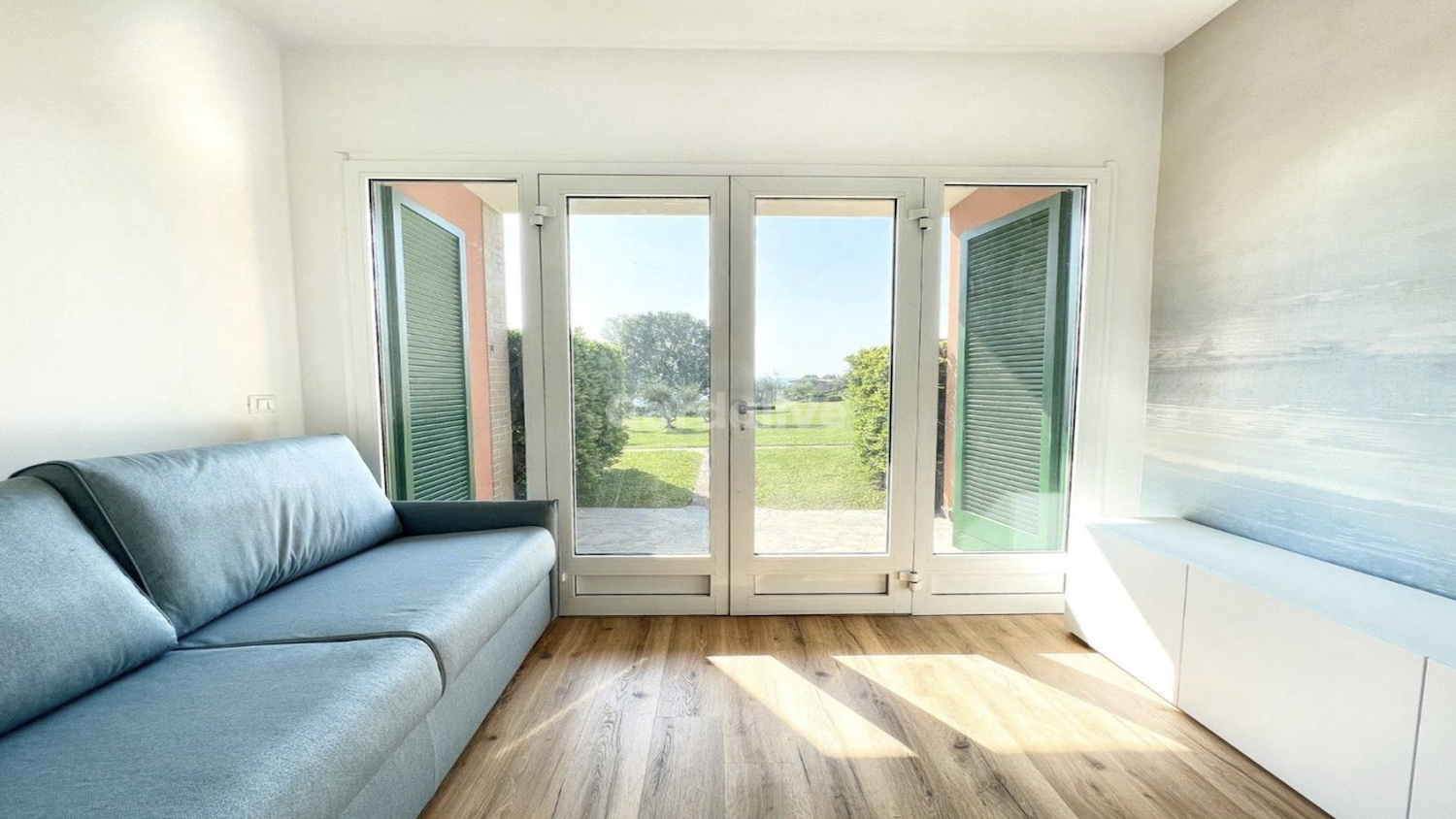 La zona giorno è ampia e molto luminosa, con cucina a vista e grande vetrata che conduce al portico privato, uno spazio esterno riservato perfetto per momenti di relax, colazioni all’aperto o cene al tramonto. Dal soggiorno si accede direttamente al grande parco condominiale, finemente curato, che ospita la piscina fronte lago e aree verdi di assoluto pregio.