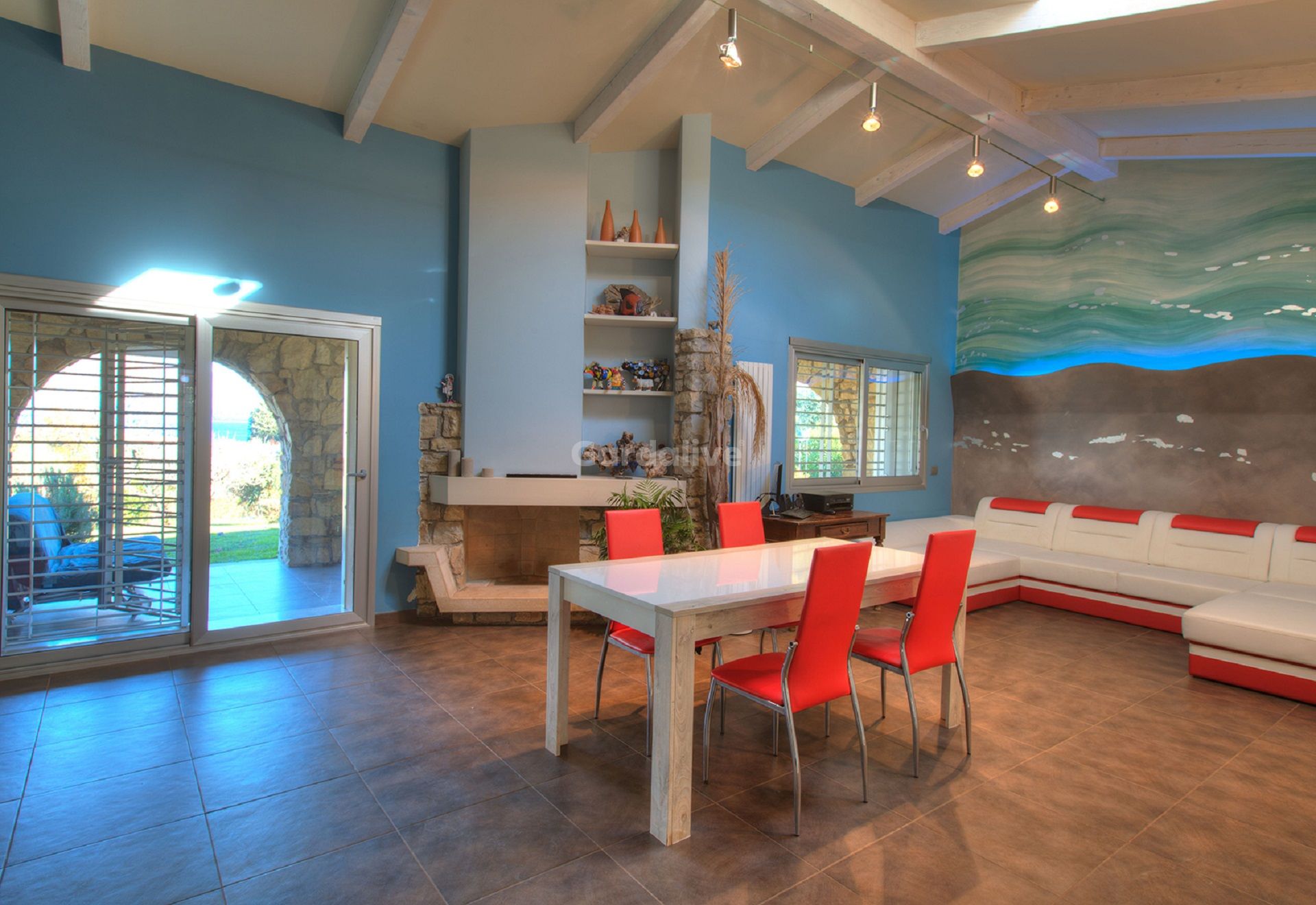 Il piano terra ospita una luminosa zona giorno con soggiorno, zona pranzo e cucina abitabile di design con isola centrale, oltre a bagno di servizio e locale polivalente utilizzabile come studio o camera ospiti. Tutti gli ambienti hanno accesso diretto al giardino, al portico e alla zona piscina.