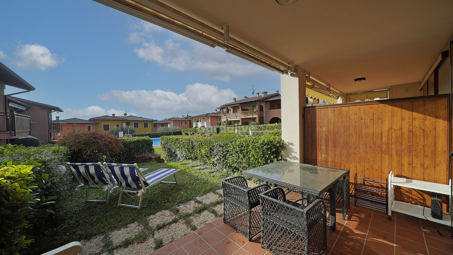 Appartamento con giardino privato in residence con piscina e vista lago