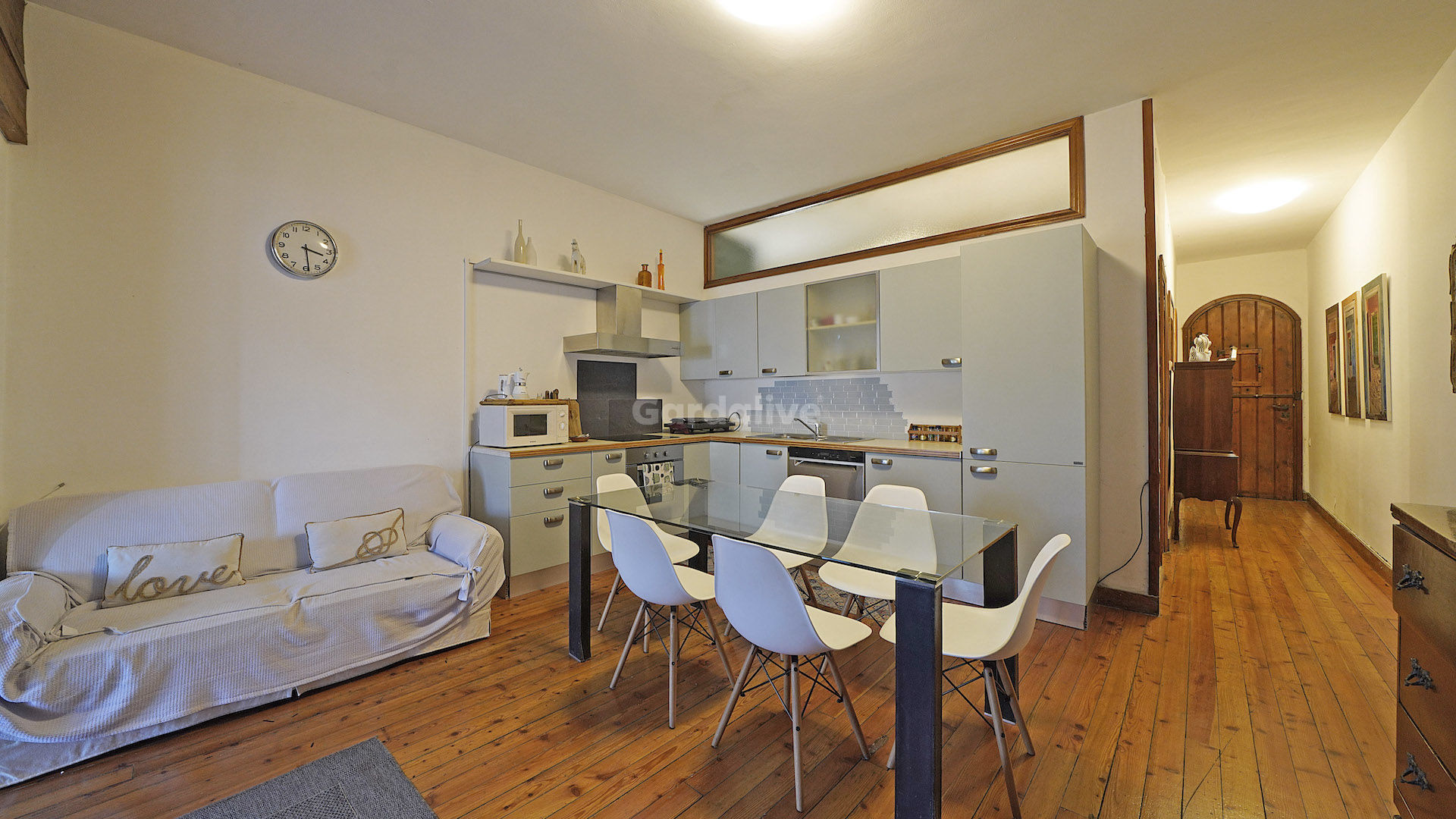 Una volta entrati, il corridoio di ingresso conduce nell'ampio soggiorno con angolo cottura, dal quale si accede alla meravigliosa terrazza con vista lago. La zona notte è composta da un rispostiglio/lavanderia, camera matrimoniale e bagno.