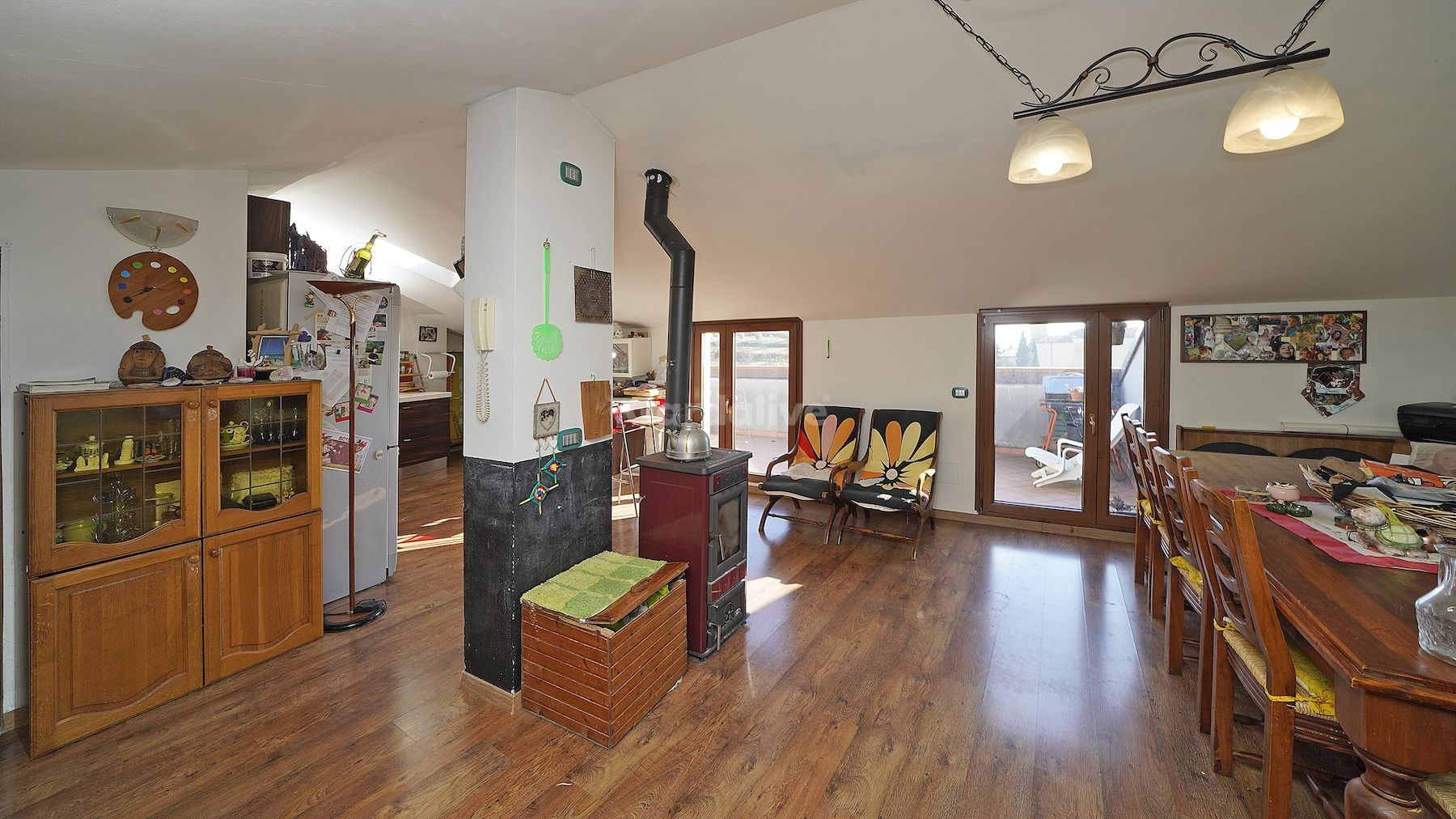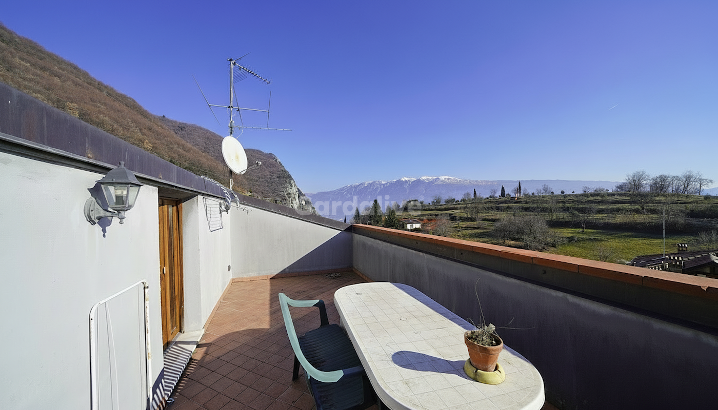 Der Eingang führt in ein helles Wohnzimmer mit Holzofen, das direkten Zugang zu einem Panoramabalkon bietet und einen offenen Blick auf den Gardasee sowie die umliegenden Berge freigibt. Auf derselben Ebene befinden sich ein Badezimmer mit Fenster, zwei Doppelzimmer, beide mit Zugang zum Balkon, sowie ein praktischer Abstellraum. Abgerundet wird das Stockwerk durch einen Galerie-Raum, derzeit als drittes Schlafzimmer genutzt, der sich auch ideal als Arbeitszimmer oder Rückzugsbereich eignet.