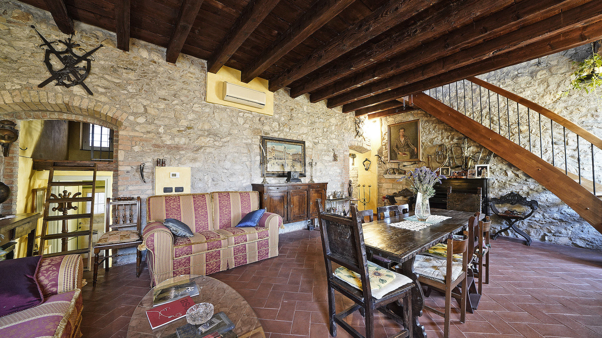 Die Treppe aus Terrakotta aus Impruneta führt in den zweiten Stock, der einen charmanten Wohnbereich mit einem funktionierenden Kamin und einer großen Wand aus Sichtstein anbietet. Die Küche ist vom Wohnzimmer getrennt und bietet somit absolute Privatsphäre. Schließlich befindet sich im ersten Stock auch ein kleines Gäste-WC.