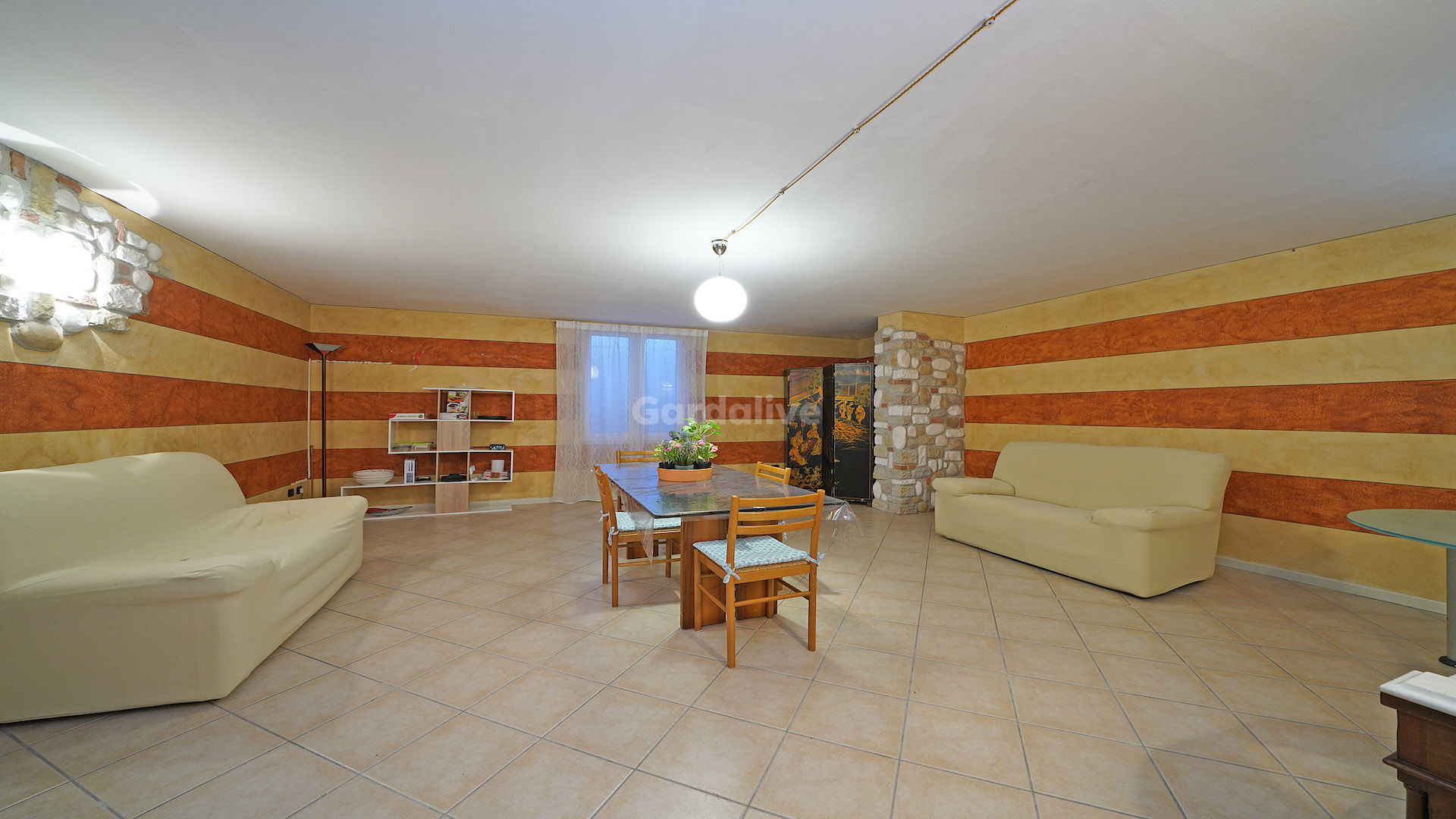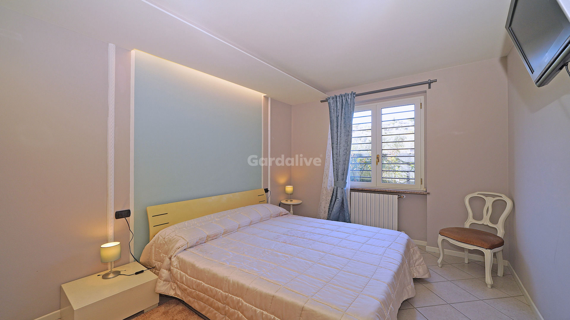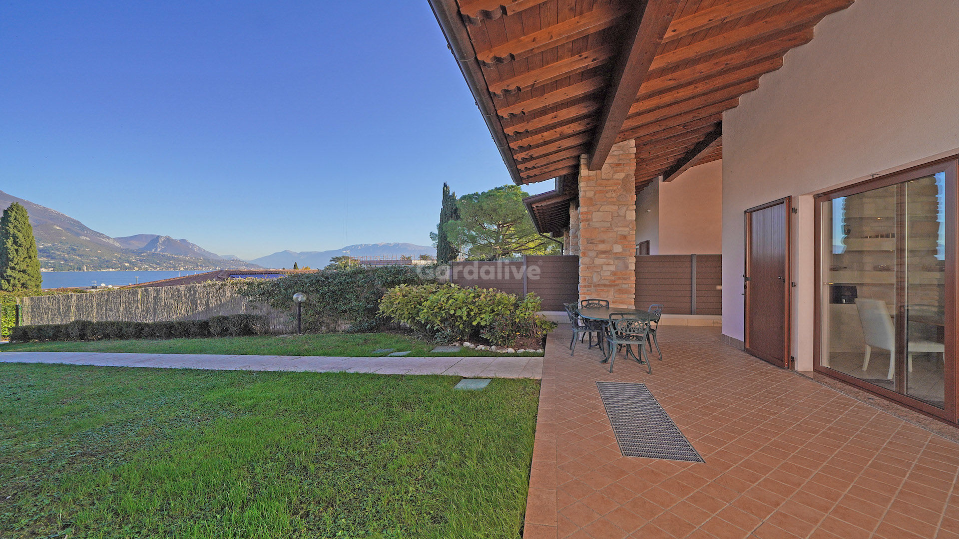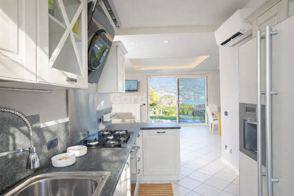 Das Erdgeschoss besteht aus einem hellen, offenen Wohnzimmer mit Zugang zur Veranda und zum Garten mit Blick auf den Gardasee, einer maßgefertigten offenen Küche, zwei Doppelschlafzimmern, von denen eines eine Suite mit eigenem Bad ist, und einem Dienstbad.