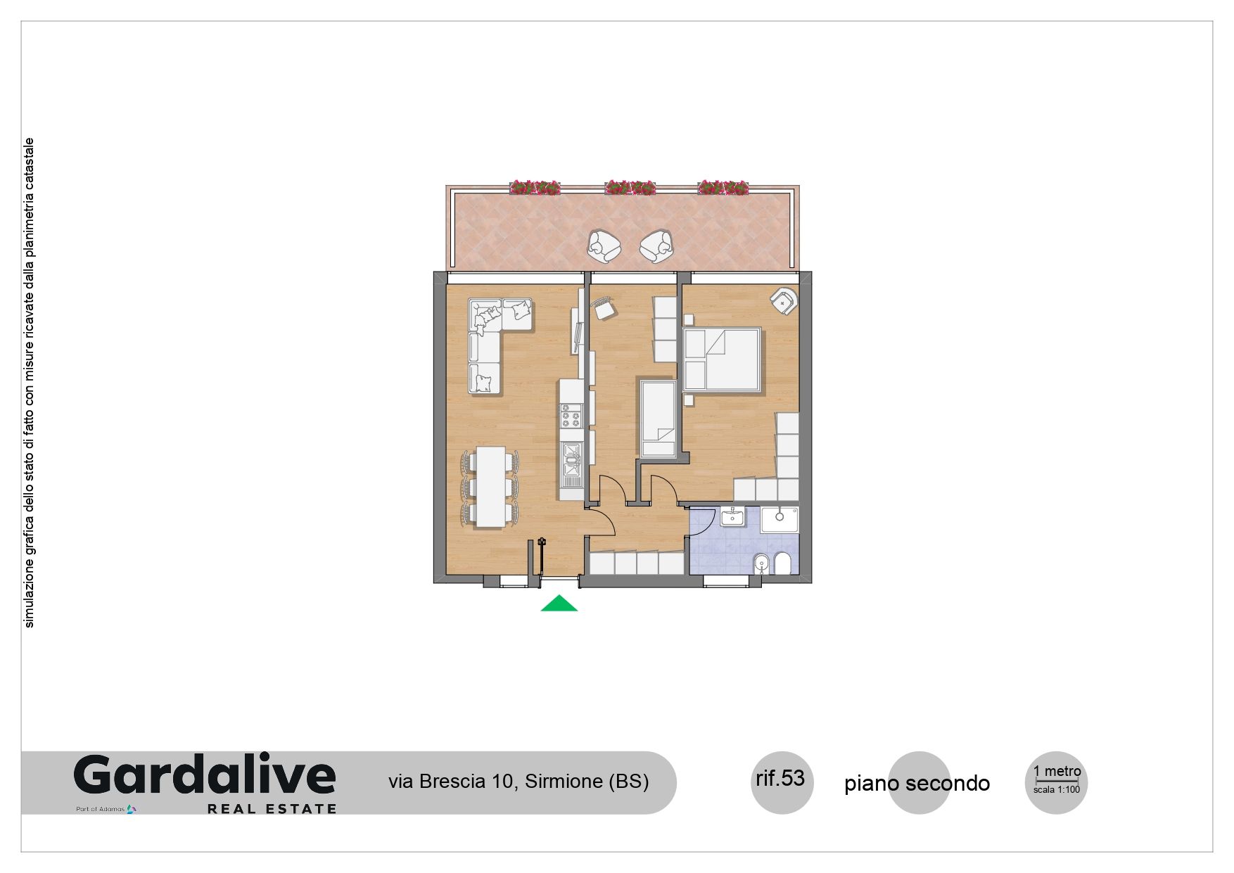 Der Schlafbereich, der durch einen funktionalen Flur mit maßgefertigten Schränken abgetrennt ist, bietet ein geräumiges Hauptschlafzimmer und ein komfortables Zweibettzimmer, beide mit direktem Zugang nach draußen. Die Immobilie wird durch eine praktische Einzelgarage und einen geräumigen 7 m² großen Keller ergänzt. Eine perfekte Lösung für alle, die Eleganz, Privatsphäre und höchsten Komfort am Gardasee suchen.