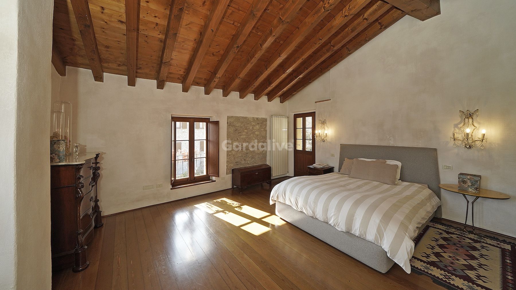 Im Obergeschoss verbindet der Schlafbereich Komfort und Charakter: ein Doppelzimmer mit sichtbaren Holzbalken, ein Badezimmer und eine Master-Suite mit geräumigem begehbarem Kleiderschrank, großem Bad und hellem Schlafzimmer. Auch hier bietet der Balkon Ausblicke auf das historische Zentrum und die umliegenden Berge.