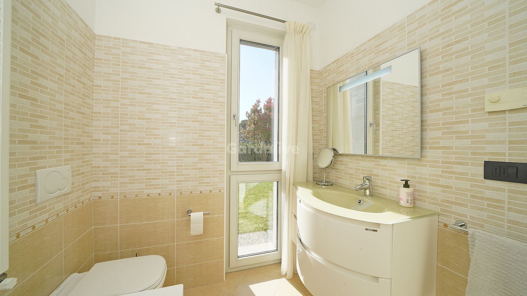 Der separate Eingang führt ins Erdgeschoss, wo sich der Wohnbereich erstreckt: ein einladender Raum, der dank großer Fensterfronten direkt mit dem privaten Garten verbunden ist. Hier öffnet sich der Raum und wird durch einen exklusiven Pool ergänzt, eingebettet in eine ruhige Umgebung, die sowohl zu entspannten Momenten als auch zu geselligen Anlässen einlädt. Auf derselben Ebene befindet sich ein Badezimmer.